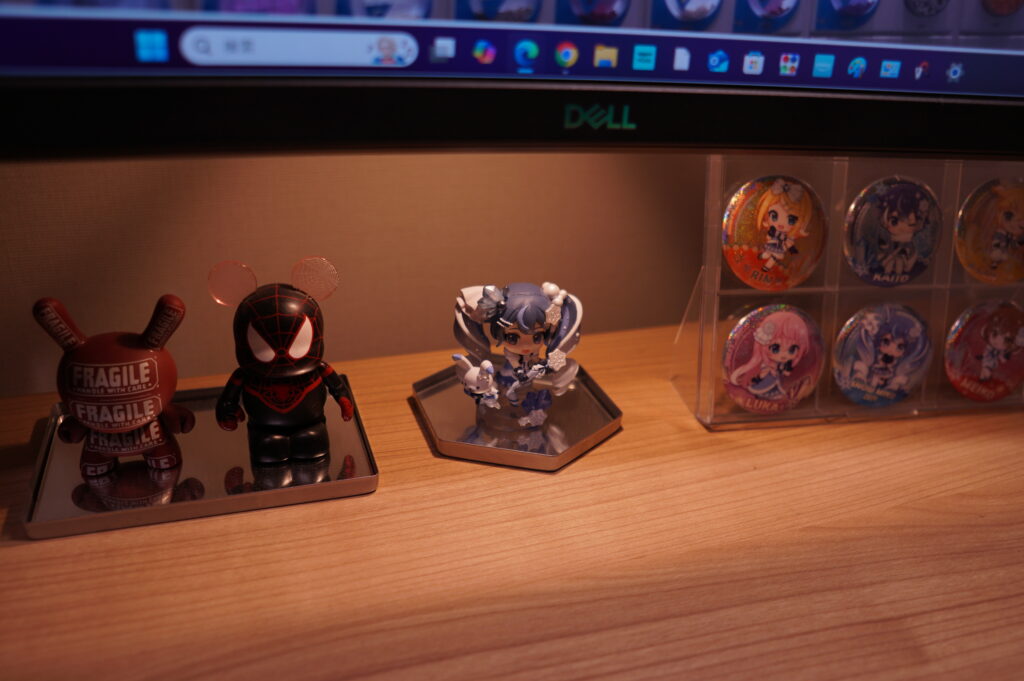 モニターアームにより確保されたディスプレイ下のスペースにはお気に入りのフィギュアを、3coinsのミラートレイの上に置いてます。