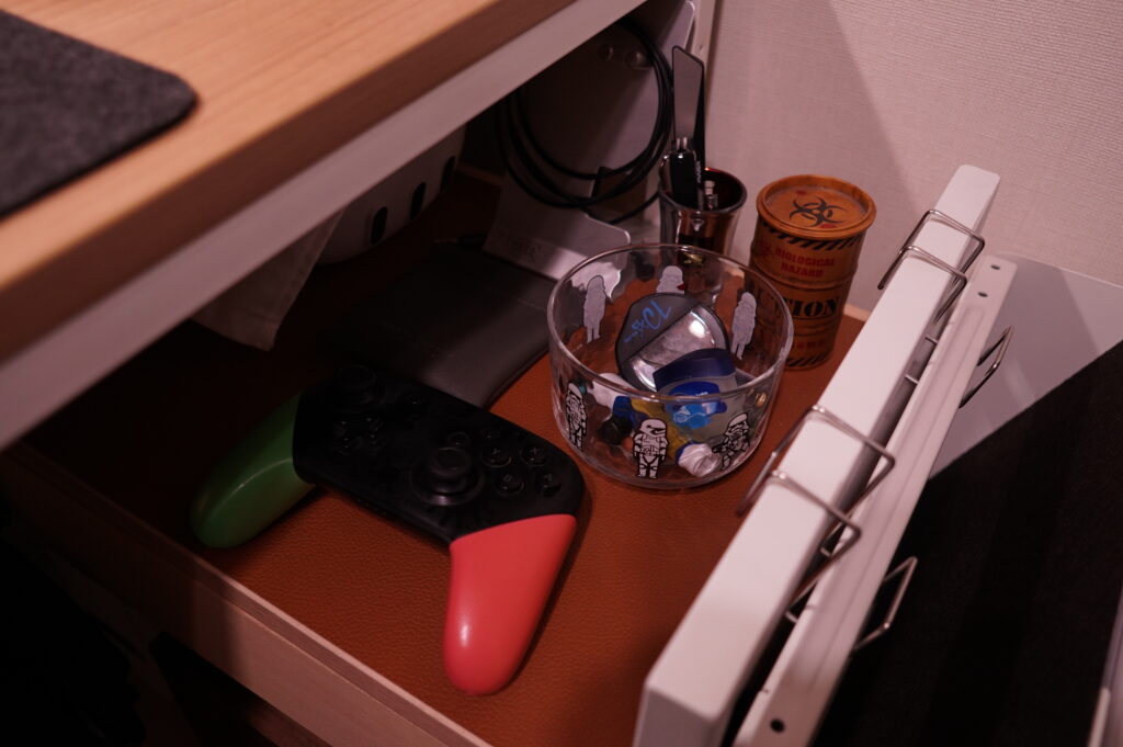 天板の上にはNintendo switchとMetaquest3、その他小物などを置いています。