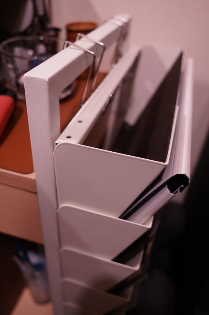 デスクワゴンに取り付けているのがIKEAの新聞ラック。無印のフックを使ってかけています。